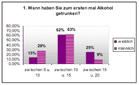 Wie folgende Darstellung zeigt gaben 62 % der befragten weiblichen Studenten und 63 % der Männer an, im Alter zwischen 10 und 15 Jahren erstmals Alkohol konsumiert zu haben. Dieses Alter liegt in etwa im üblichen Durchschnittsbereich von 12,8 Jahren (Stangl, 2005).