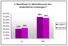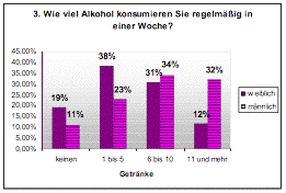 Dieses Ergebnis entspricht in etwa einer Studie des Unicum. Ein wesentlicher Unterschied lässt sich laut einer Studie des Unicum zwischen weiblichen und männlichen Studenten beim Alkoholkonsum erkennen. Die Untersuchung zeigte, dass 14,9 Prozent der Männer in den letzten 30 Tagen vor der Befragung mind. zehn Mal Alkohol getrunken haben, während es nur 7,6 Prozent der Frauen waren (Unicum, 2003).